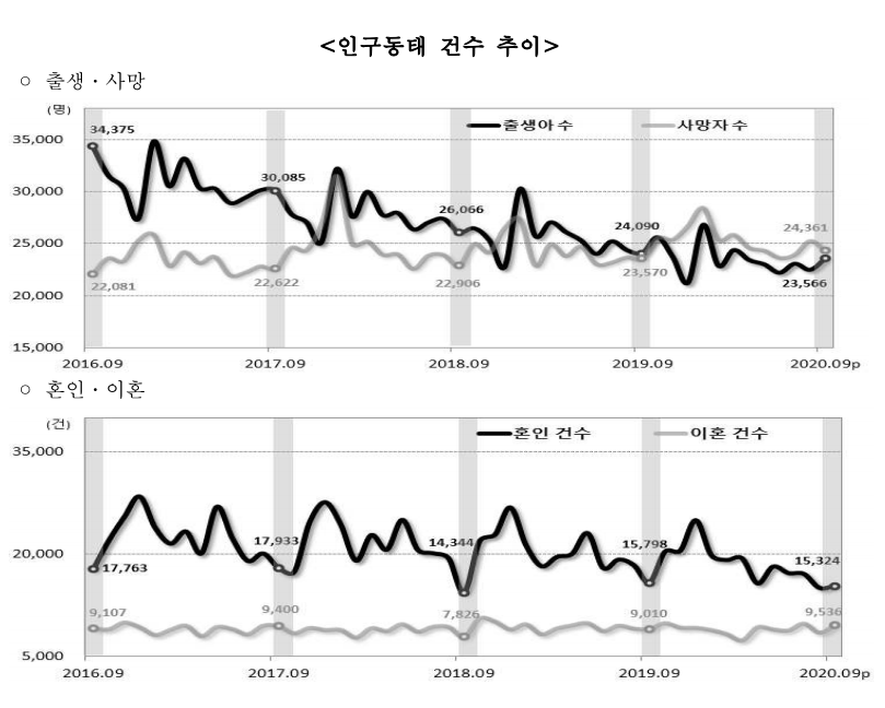 별도로 2020년 11월 전체 인구는 51,834,302명이고 10월 인구는 51,838,016명으로 한달 사이 거의 4천명 가까이 감소하였습니다.